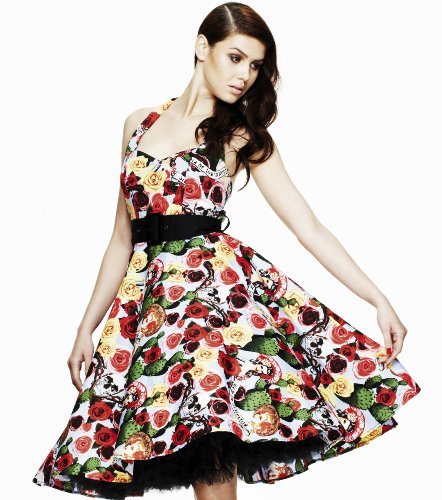 IMPORTANT: The background is a pale blue, not picked up on the image. Look at the close up swatch for a better indication of background colour On a pale blue background, the Hell Bunny Mexico 50s Dress has a colourful all over design with a Dia de los Muertos theme. Roses, cactus, skull & pistols and pinup cowgirls make up this hot design. This halterneck 50s dress is zip fastening at the back and also has an elastic smocked panel to give a perfect fit. The chunky black belt sets off the classic style perfectly. The model is wearing the 25" Hell Bunny Black Petticoat for extra volume. This dre